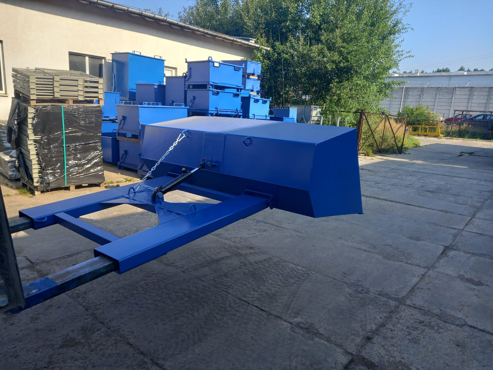 Srdcem zařízení je robustní hydraulický válec, který nahrazuje mechanické páky. Díky němu nemusí vykládka probíhat prudce „najednou“. Operátor může pomalu naklánět lžíci, dávkovat materiál, zastavit vysypávání v libovolném okamžiku nebo rychle vyprázdnit celý obsah. To je neocenitelné při plnění vaků Big-Bag, domíchávačů nebo při přesném rozprostírání kameniva. Velký úhel náklonu zaručuje, že uvnitř nezůstanou zbytky zboží.