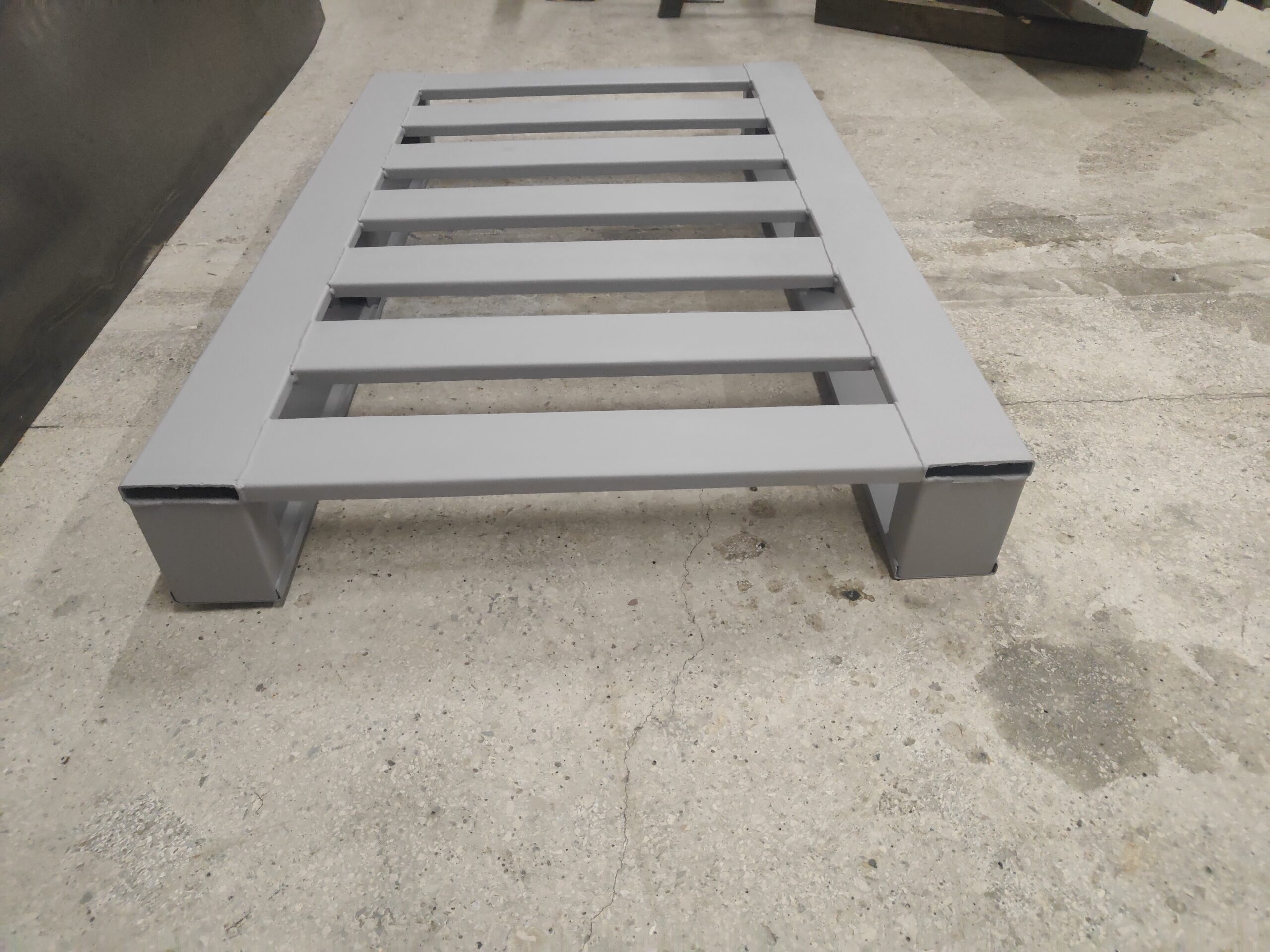 Robuste Stahlpalette PS mit Standardmaßen von 1200×800 mm. Schweißkonstruktion aus Profilen und U-Profilen, auf Kufen gelagert. Stabile Alternative zu Holzpaletten, die ein sicheres Stapeln und eine intensive Nutzung in Logistik und Lagerhaltung ermöglicht.