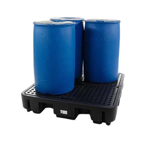 The Jonesco 250 L spill pallet for 4 drums is a heavy-duty containment pallet with a square base, designed for the safe storage of four standard 200-liter drums. It is a key piece of equipment for industrial facilities where environmental protection and workplace safety are critical when storing liquid substances.