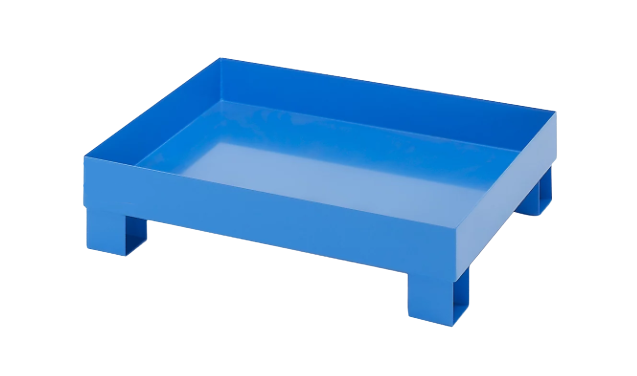 The tray is equipped with structural feet that allow safe transport using manual pallet trucks and forklift trucks. They also provide sufficient clearance from the floor, facilitating easy handling of the tray within warehouse spaces. The entire surface of the tray – both internal and external – is coated with a polyurethane paint, which serves as effective corrosion protection and shields the steel from moisture and aggressive chemical substances.