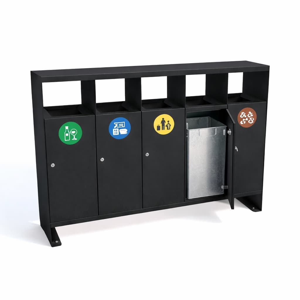 The Waste Sorting Station 5×40 is a modern and durable solution for selective waste collection in public and private spaces. Its robust steel construction, minimalist design, and customizable color options make it ideal for use in city parks, residential areas, office buildings, hotels, schools, and industrial facilities.